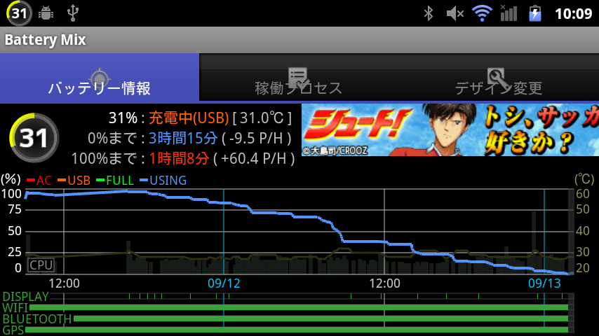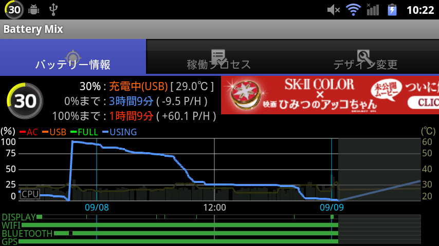 DISPLAYの部分を見たらどれくらい使ったかわかるけど、N-04Cは電源を入れて放置してる状態なのでほぼ使ってない。