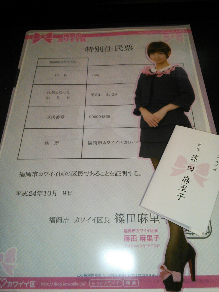 以前いってたカワイイ区の住民票が届いた。